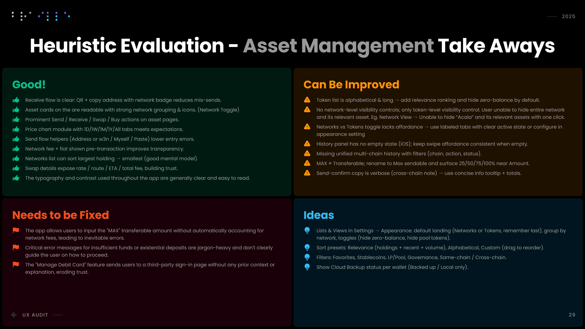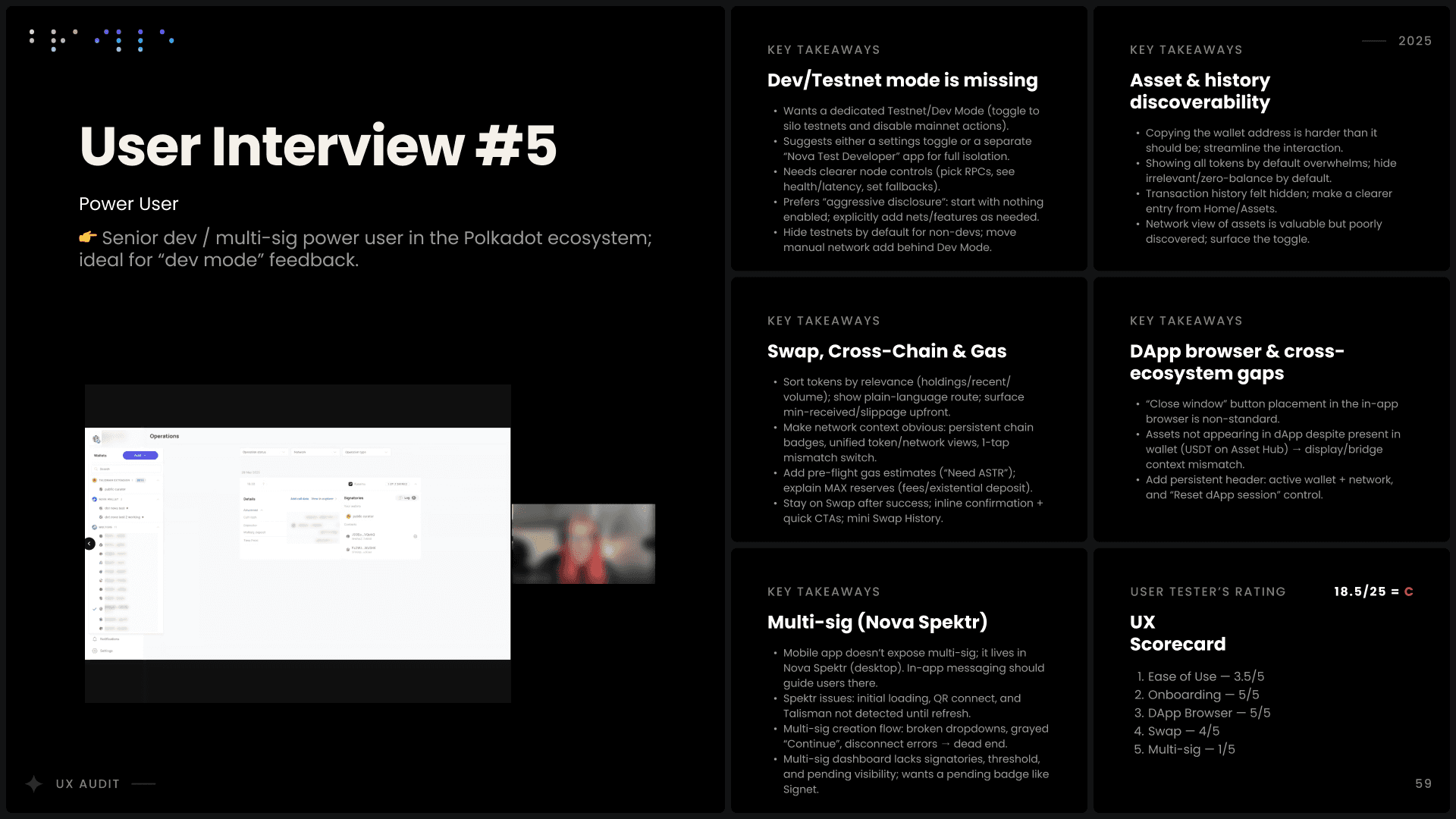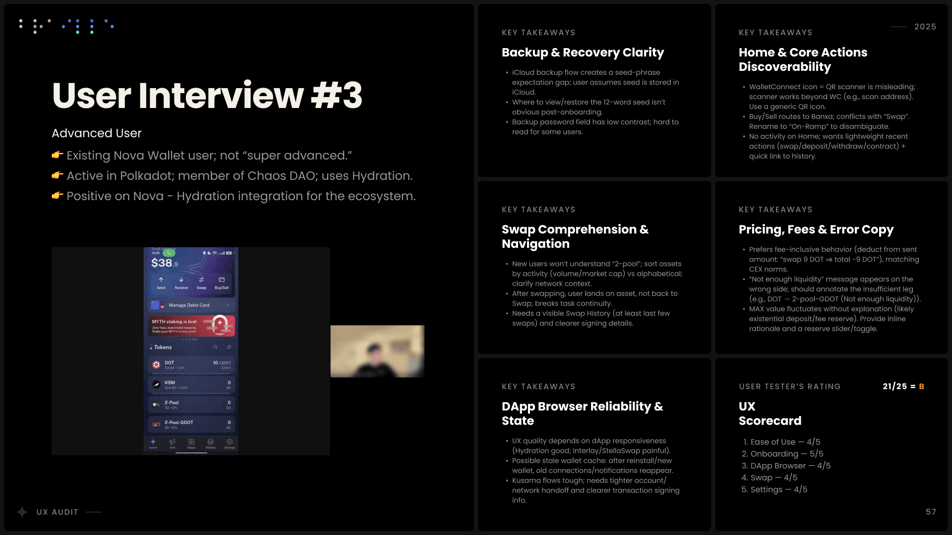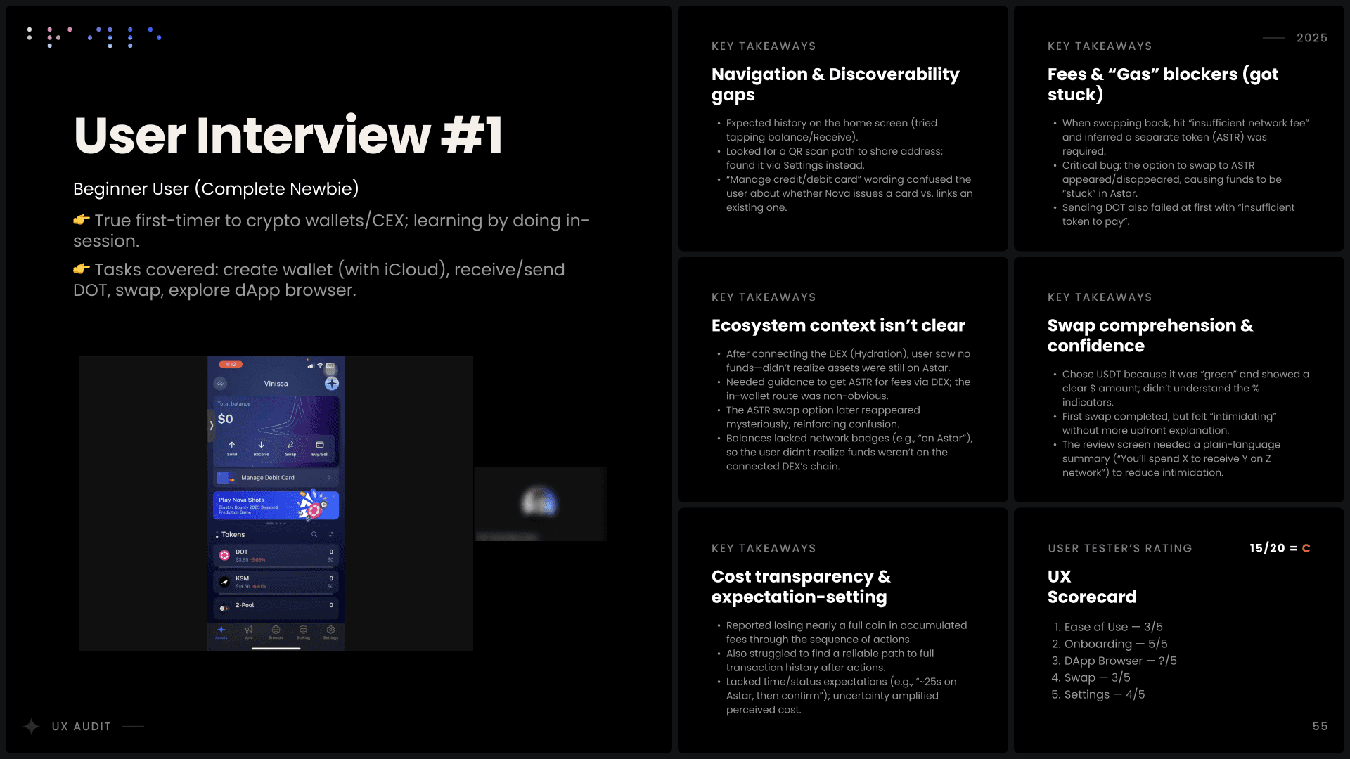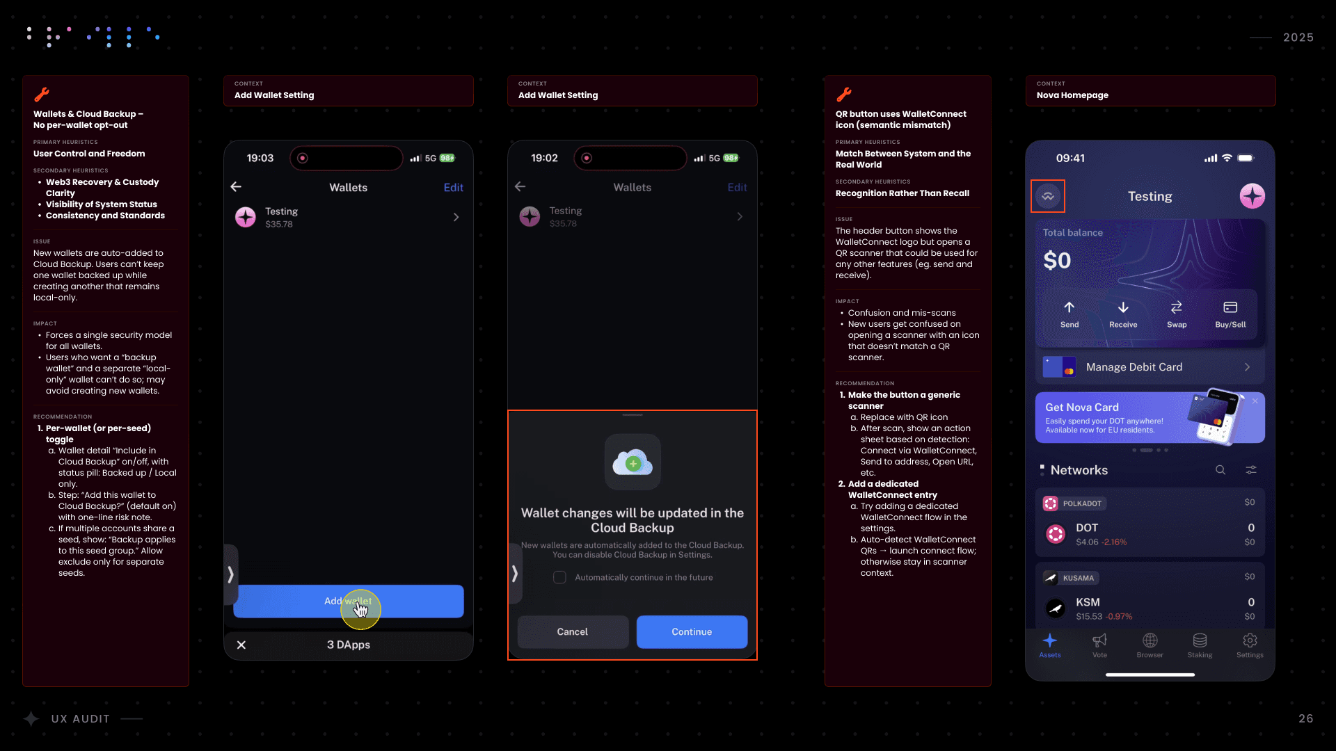 I conducted a comprehensive UX audit of Nova Wallet’s core infrastructure, covering Asset Management, the dApp Browser, and critical transaction flows like Swap and Multisig. Commissioned by the Polkadot UX Bounty, this strategic deep-dive was designed to identify friction points and optimize the user experience for one of the ecosystem’s flagship products.