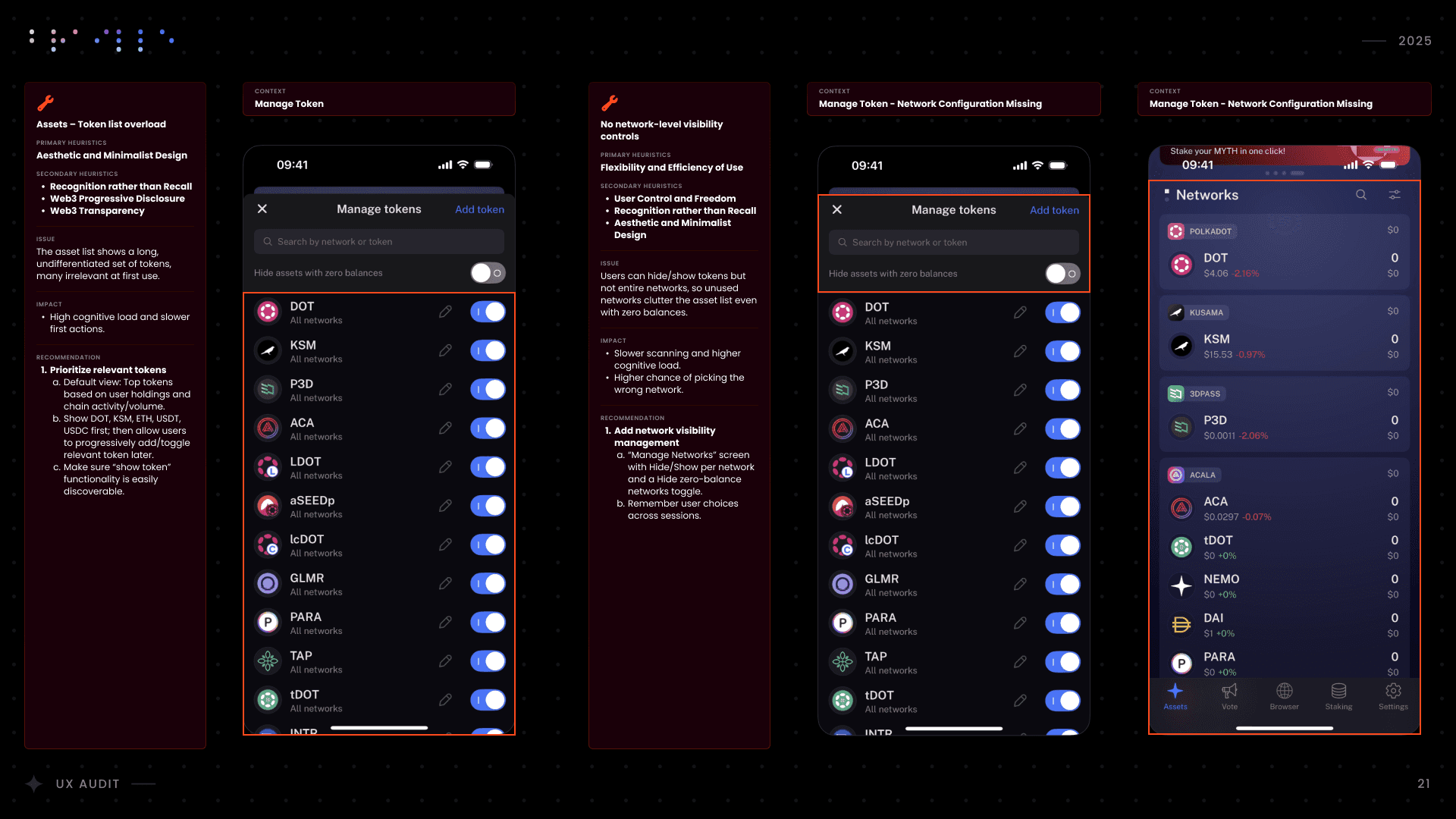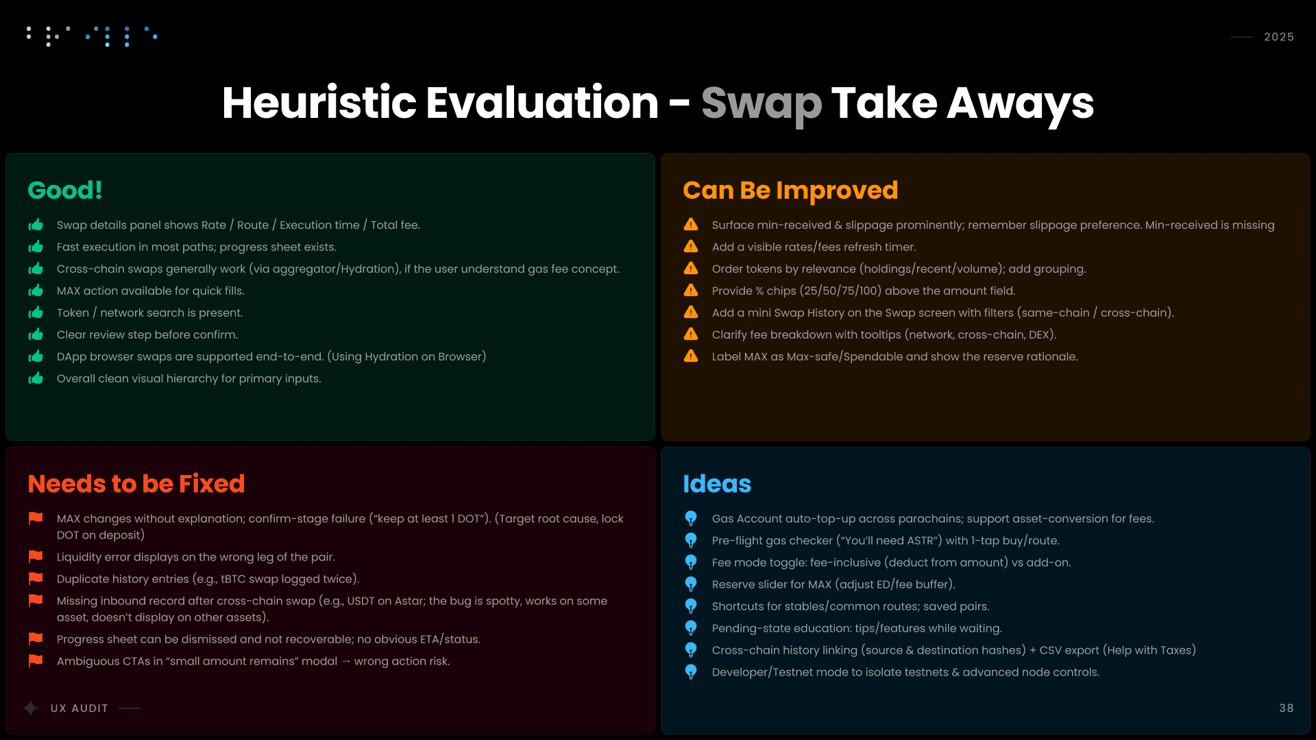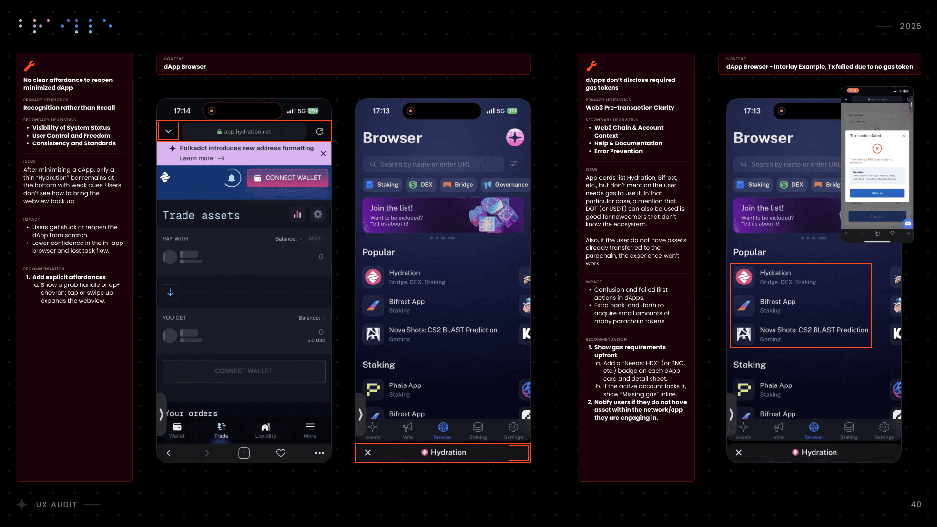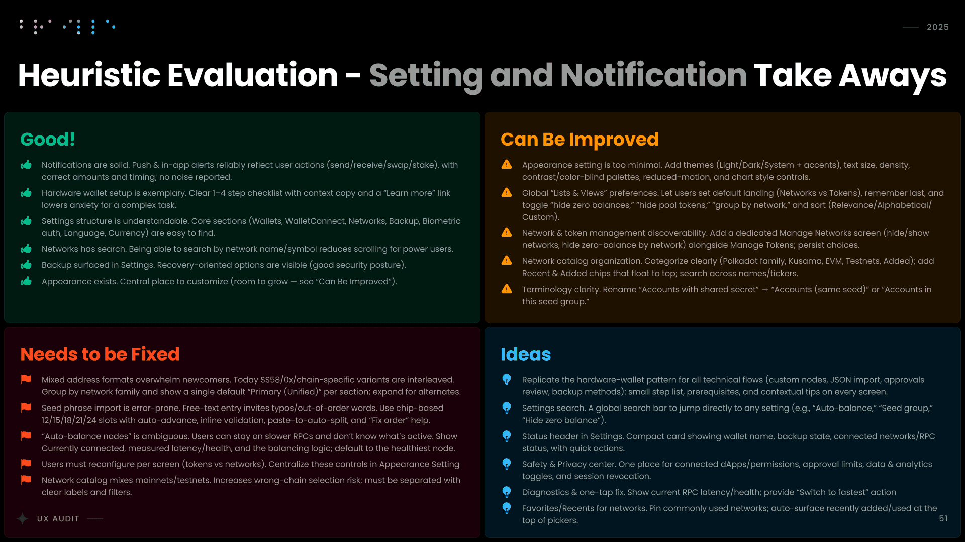 I conducted a comprehensive UX audit of Nova Wallet’s core infrastructure, covering Asset Management, the dApp Browser, and critical transaction flows like Swap and Multisig. Commissioned by the Polkadot UX Bounty, this strategic deep-dive was designed to identify friction points and optimize the user experience for one of the ecosystem’s flagship products.