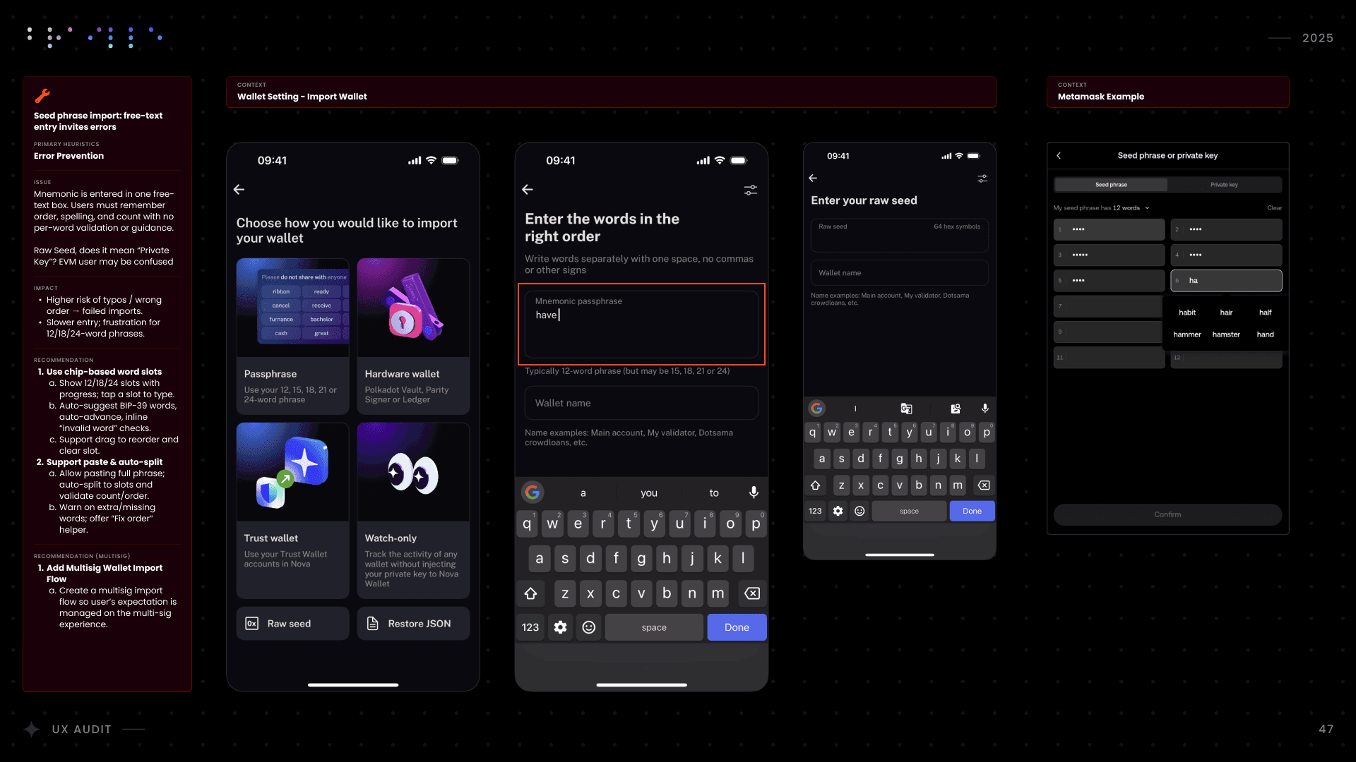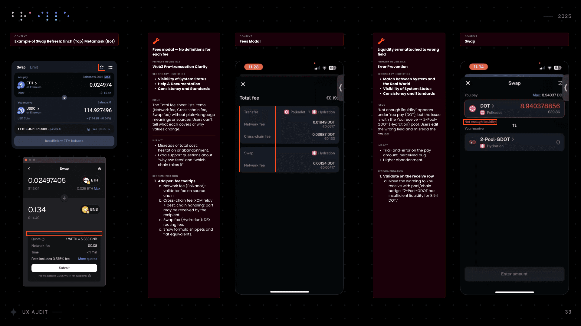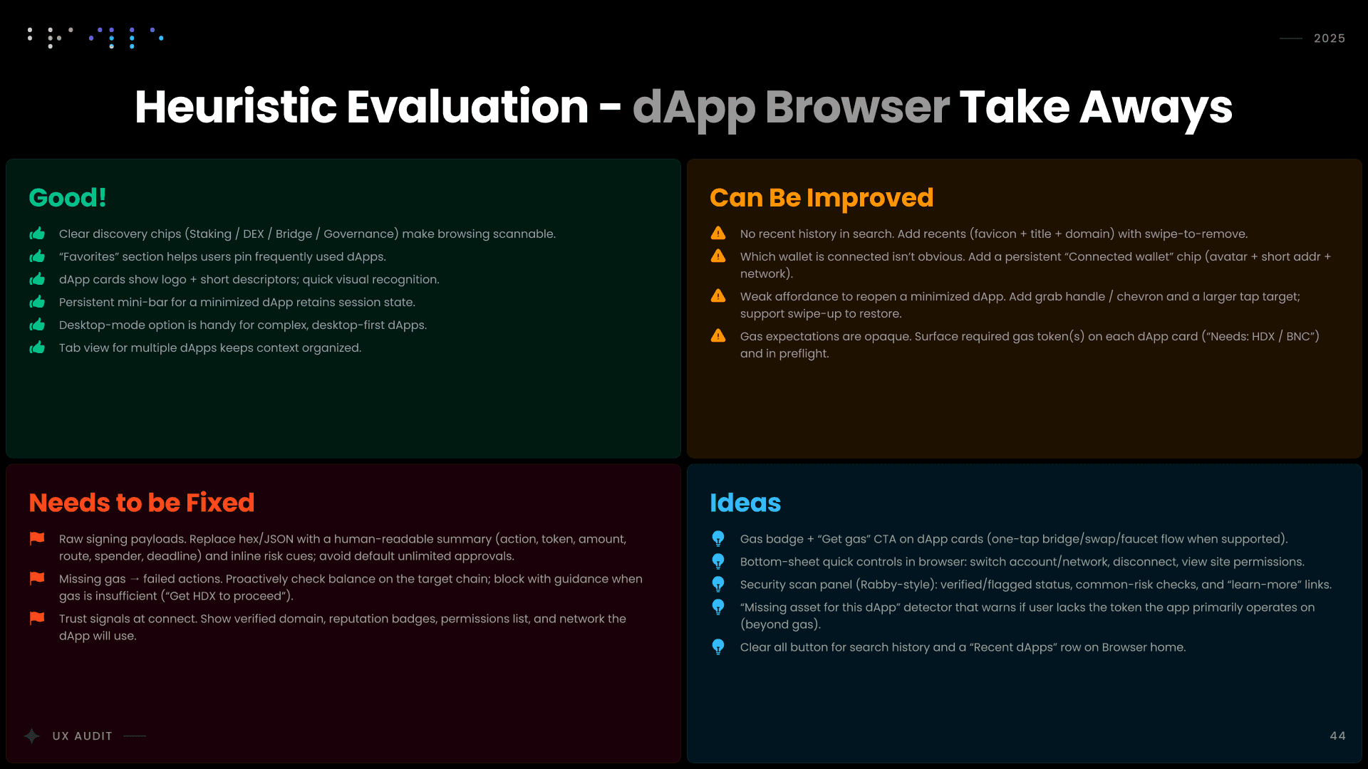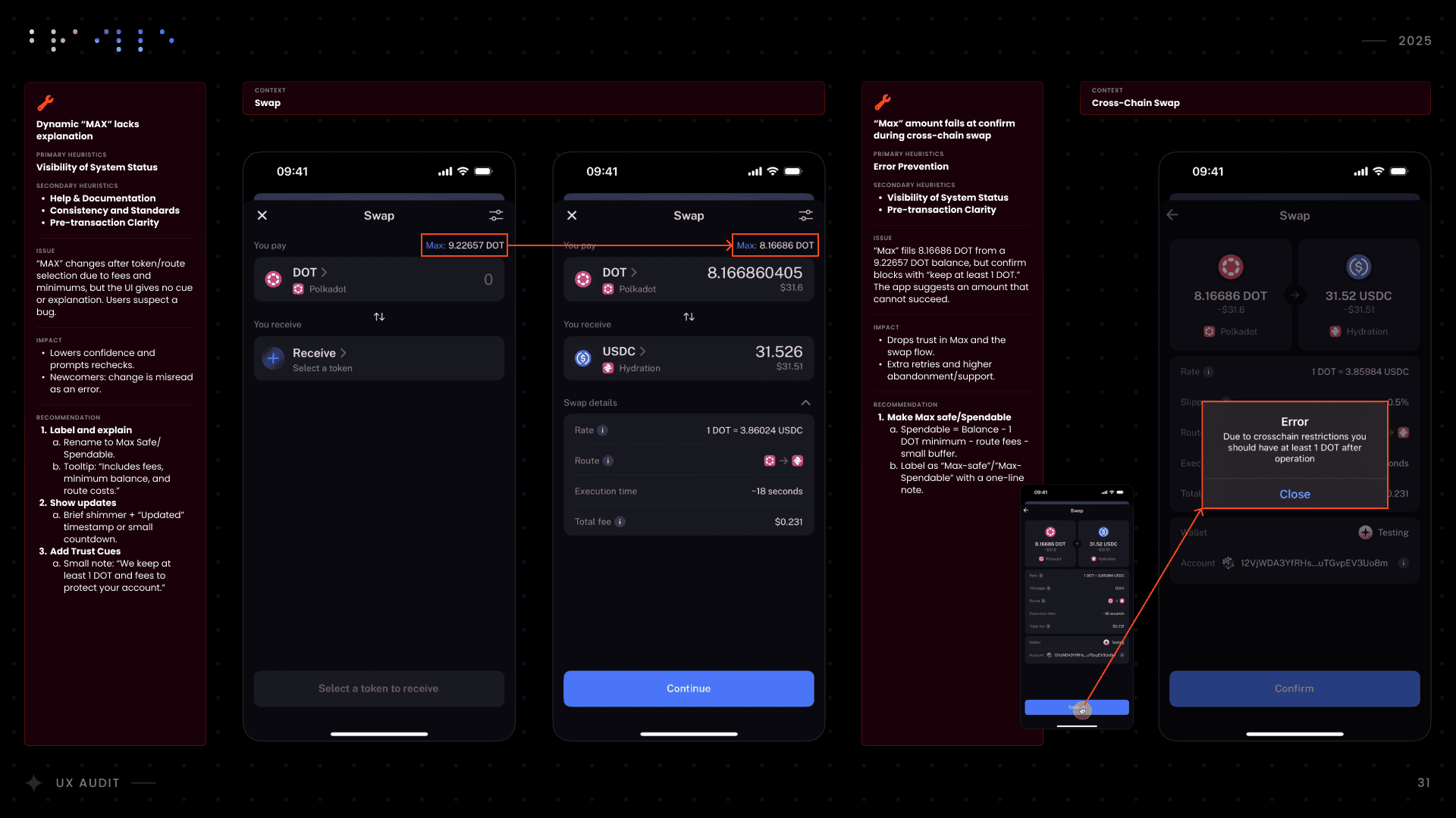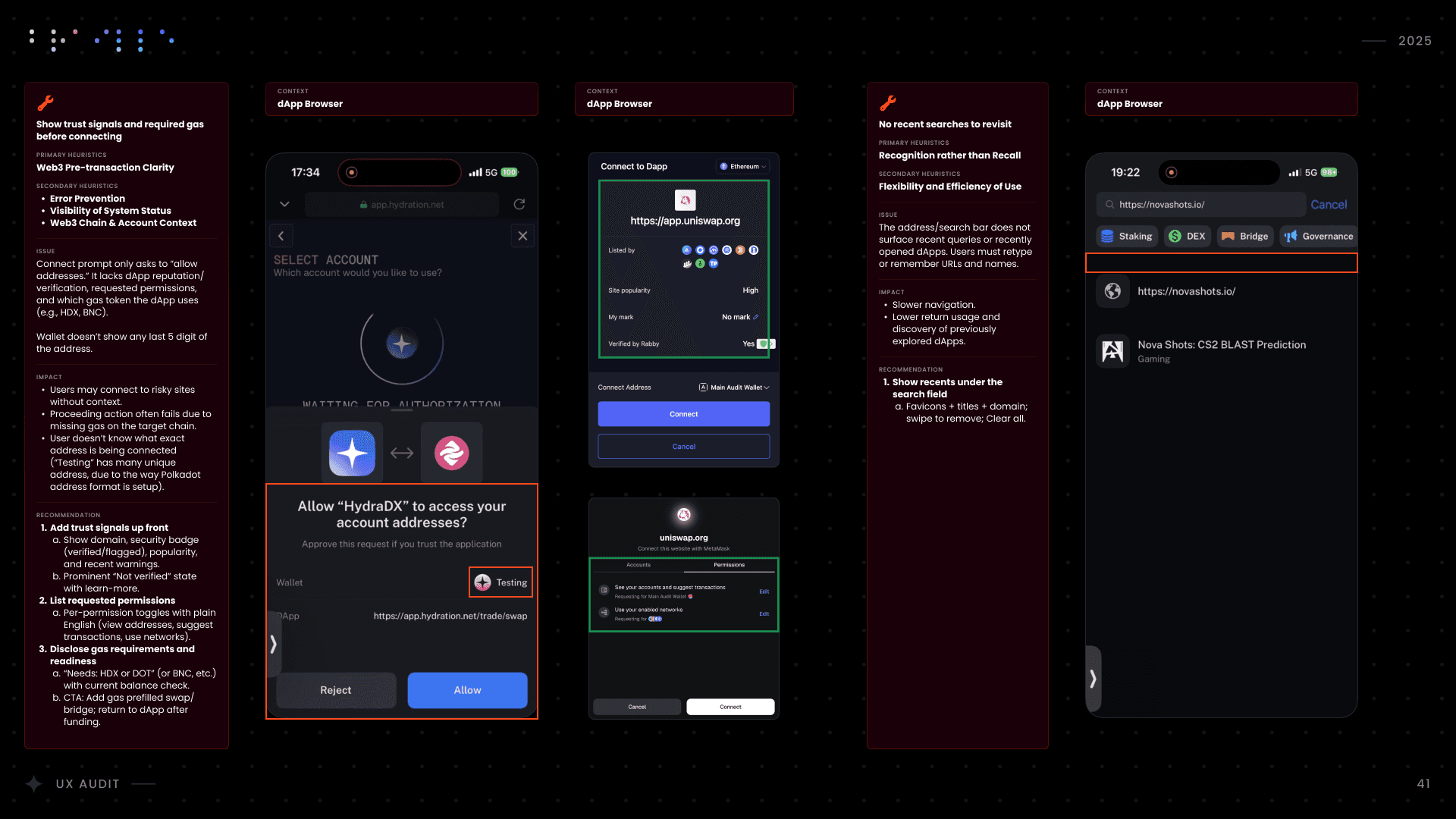 I conducted a comprehensive UX audit of Nova Wallet’s core infrastructure, covering Asset Management, the dApp Browser, and critical transaction flows like Swap and Multisig. Commissioned by the Polkadot UX Bounty, this strategic deep-dive was designed to identify friction points and optimize the user experience for one of the ecosystem’s flagship products.