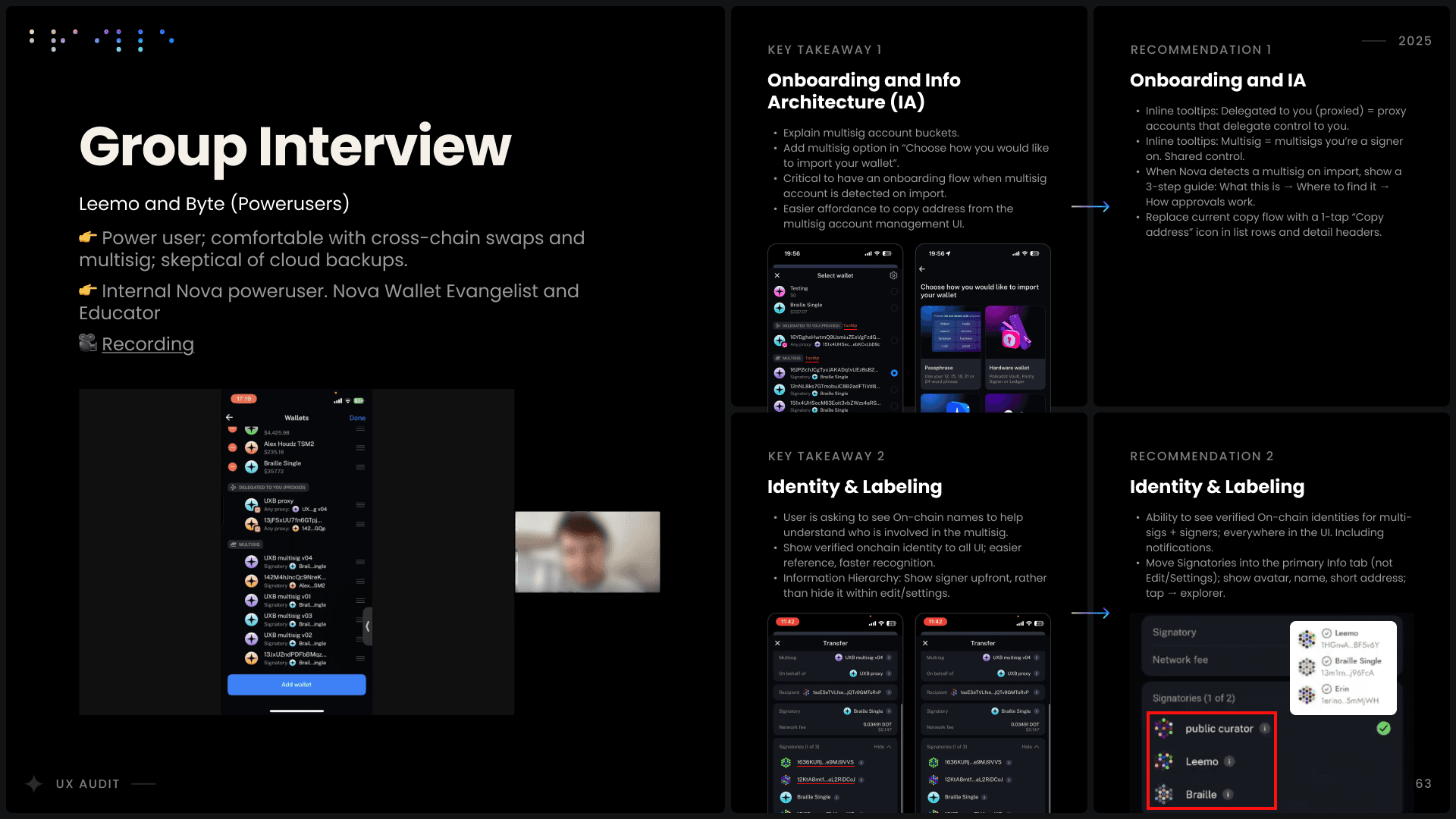 Commissioned by the Polkadot UX Bounty through Braille Studio, I executed a 1-month technical audit of Nova Wallet’s core infrastructure. Benchmarking against leading Web3 wallet standards, I identified recurrent friction in Asset Management and dApp Browser functionality, specifically where cross-chain complexity overwhelmed the user experience. Collaborating with the Nova CTO, I validated backend constraints to ensure every recommendation was technically viable. A key focus was the Cloud Backup onboarding, where I surfaced critical gaps in how technical requirements were communicated, removing a barrier to asset backup for non-technical users. Through power-user testing on Multisig, I refactored the notification and approval journey to eliminate opaque transaction states. By introducing global status visibility and human-readable system remarks, I shifted the experience from manual "recall" to intuitive action, the audit was presented to the team and they have planned to implement 70%+ of the recommendations.